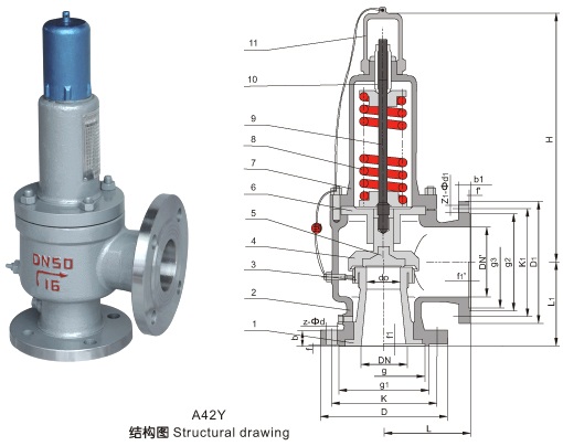 Type A42Y-C Spring Fully Open Closed Safety Valve is suitable for air, LPG, liquid and other media equipment and pipelines with operating temperature < 300 C. A42Y-P and A42Y-R types are suitable for equipment and pipelines with corrosive medium operating at temperatures less than 200 degrees Celsius as overpressure protection devices. Connecting flange standard according to JB/T... -94 Series 1. Greater than 6.4MPa by JB/T... -94 Series 2.