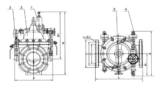 當閥門從進口端給水時,水流過針閥進入主閥控制室,出口壓力通過導管作用到導閥上。當出口壓力高于導閥彈簧設(shè)定值時,導閥關(guān)閉。控制室停止排水,此時主閥控制室內(nèi)壓力升高并關(guān)閉主閥,出口壓力不再升高。